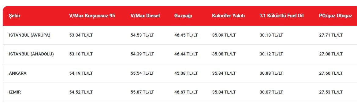 Benzin ise İstanbul’un Avrupa Yakası’nda 53 lira 34 kuruşa, Anadolu Yakası’nda 53 lira 18 kuruşa, Ankara’da 54 lira 19 kuruşa İzmir’de 54 lira 52 kuruşa depolara dolduruluyor.